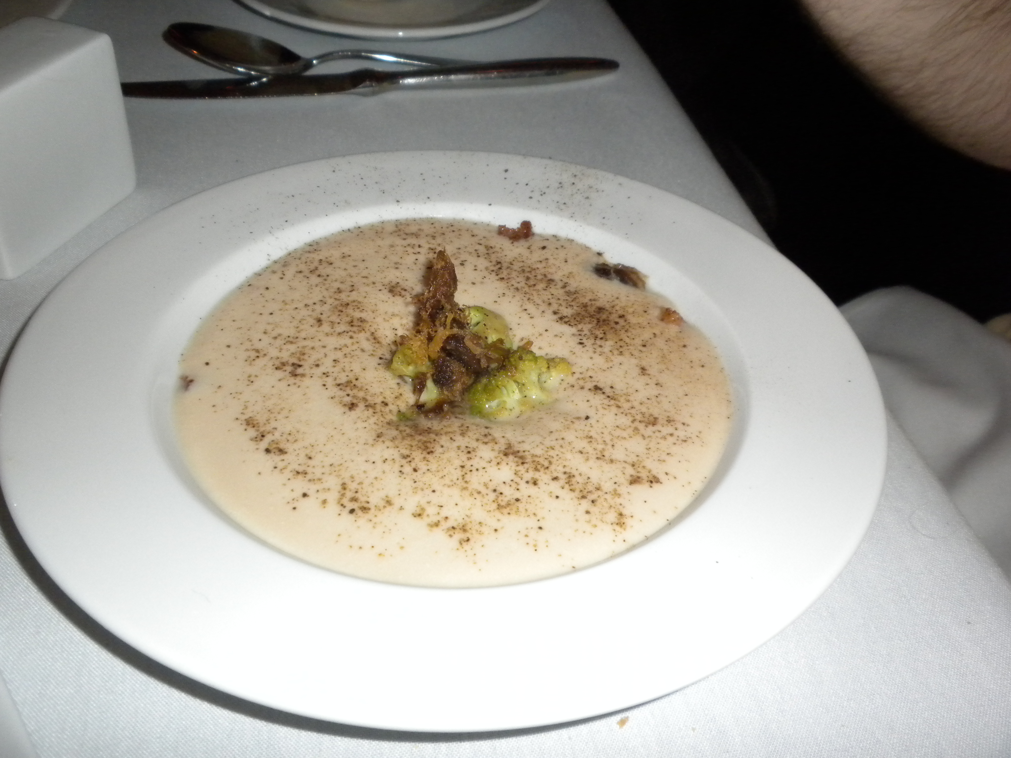 Menu: In a rectangular leather booklet, we were presented with 2 options for the first course, 3 for the main course, and 2 for dessert. The rest of the menu was still available, but each item had an additional cost on top of the $33.10 you were paying for restaurant week. Having studied the menu the night before in anticipation, I already knew what I was ordering: cauliflower soup, lightly seared salmon, carrot cake “a la Radius”.