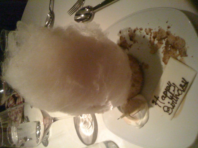 Presentation/Taste: I can’t say much about the “tart key lime & palm sugar gastrique”, mainly because I don’t know what/where it was… but the salmon was topped with swiss chard next to the beautifully displayed okinawan yam puree. I’ve never tried the purple yam before and I’m sorry I haven’t! The salmon was cooked ‘medium’ like I requested and paired well with the yam. And for dessert: Brown Butter Angel Food Cake. Known to certain diners as “The Don King”, the cake was topped with a mound of brown sugar cotton candy. What a b-day dessert this was! The cake itself was a bit too dense for me to consider it an “angel food cake”, but I wasn’t complaining, especially after trying the caramel ice cream.