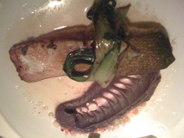Menu: Large & laminated. Oversized menus annoy me; there’s never any room for them on the table (and mainly I’m concerned that I’m going to knock over a wine glass with it). The print & style of the menu was reminiscent of Lydia Shire’s Scampo: sections read vertical & horizontal and are divided into a variety of categories (Crustacea, Wood-Fired Rotisserie, Ocean, Rice etc…). Random flags appear next to certain meals representing their country of origin. After bouncing from one food group to the other I eventually landed on the “Salmon… charred wild king w/ tart key lime & palm sugar gastrique… okinawan yam”.