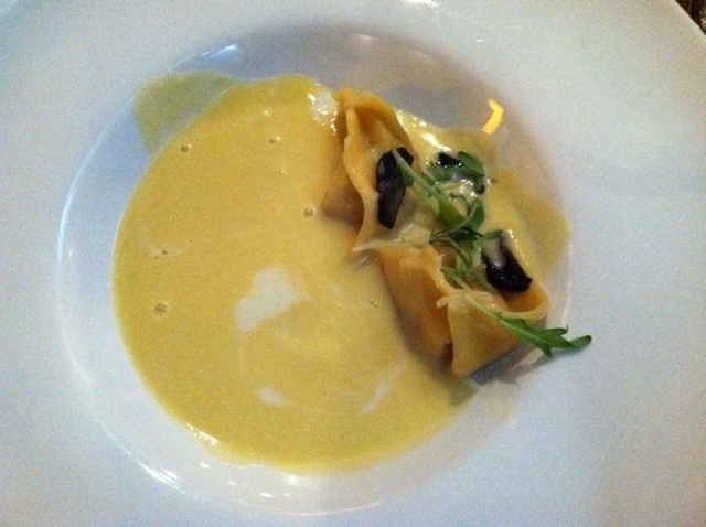 A large shallow bowl came full of 2 tortelloni and a small cup which the waiter poured the bisque from. The soup was great, smooth and flavorful. The tortelloni was a nice touch; without that addition it may have been too simple/plain.