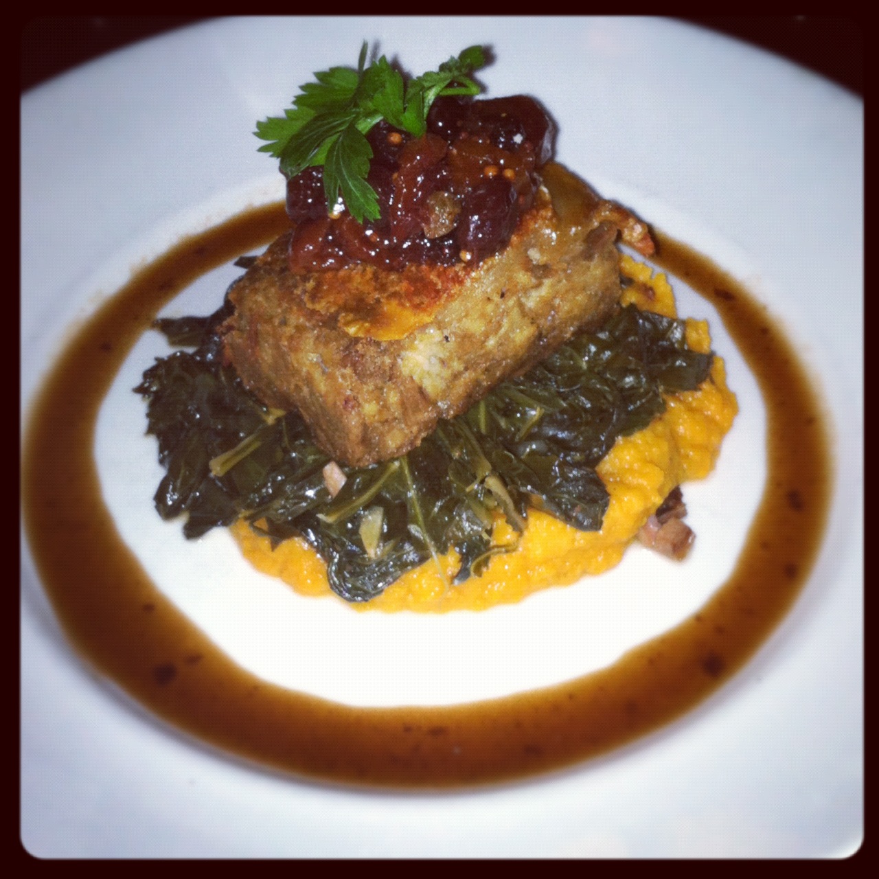 Pig Under A Brick: braised collard greens, mostarda & sweet potato puree