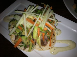 Two soft tacos came piled with green apple/carrot/Brussels sprout slaw next to a drizzle of tarragon aioli. The slaw was a bit overwhelming (I couldn’t fit it into my mouth for 1 big bite!), but the app was so good that I literally almost choked as I inhaled it.
