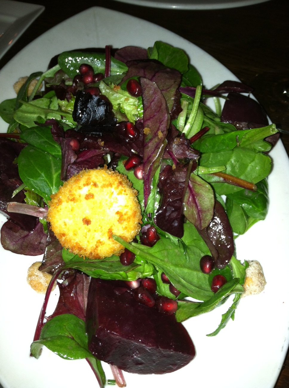 Mixed Greens: molten goat cheese, roasted beets, candied almonds, pomegranate seeds, and Zinfandel vinaigrette